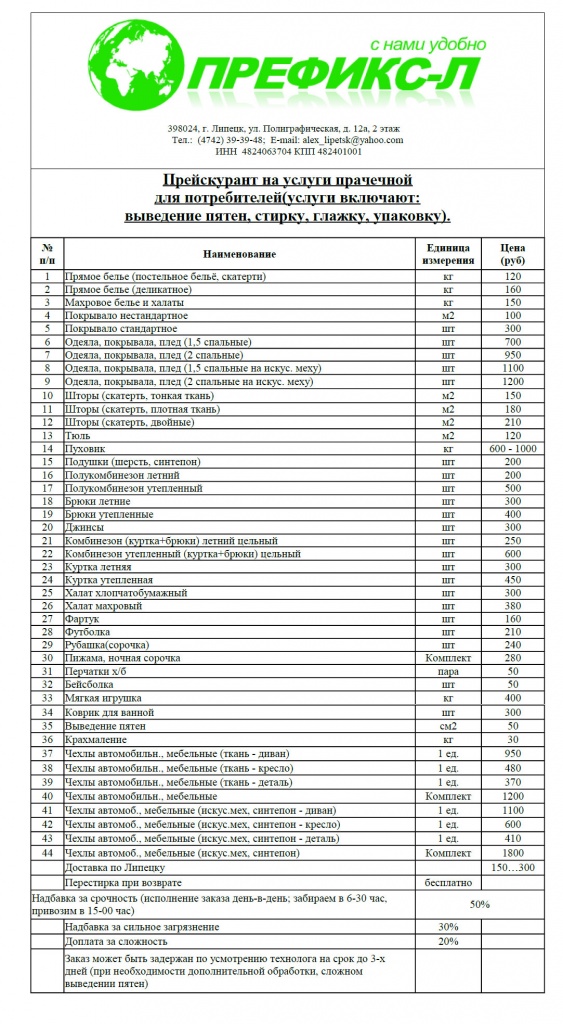 Буквально каждая хозяйка знает, что стирка белья это весьма трудоемкий процесс, который забирает кучу времени, а порой требует и приложение физической силы, если стирать вручную. Хорошо конечно, если Вы располагаете необходимой техникой, но что делать жителям общежитий, людям в командировках или семьям, которые еще не приобрели хорошую стиральную машинку? Люди, покупая вещи, желают, чтобы они выглядели как новые как можно дольше и не утрачивали свой первоначальный вид. При современном стремительном темпе жизни, в домашних условиях этого добиться весьма сложно. Идеальное решение — обратиться к профессионалам! Специалисты компании «Префикс-Л» подберут идеальный режим стирки, бережно выведут загрязнения и правильно высушат. | ![]() |